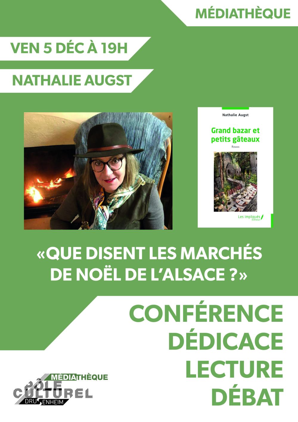 Nathalie Augst animera une conférence sur le thème des marchés de Noël, à l'occasion de la sortie de son dernier roman Grand bazar et petits gâteaux, aux éditions Les impliqués.