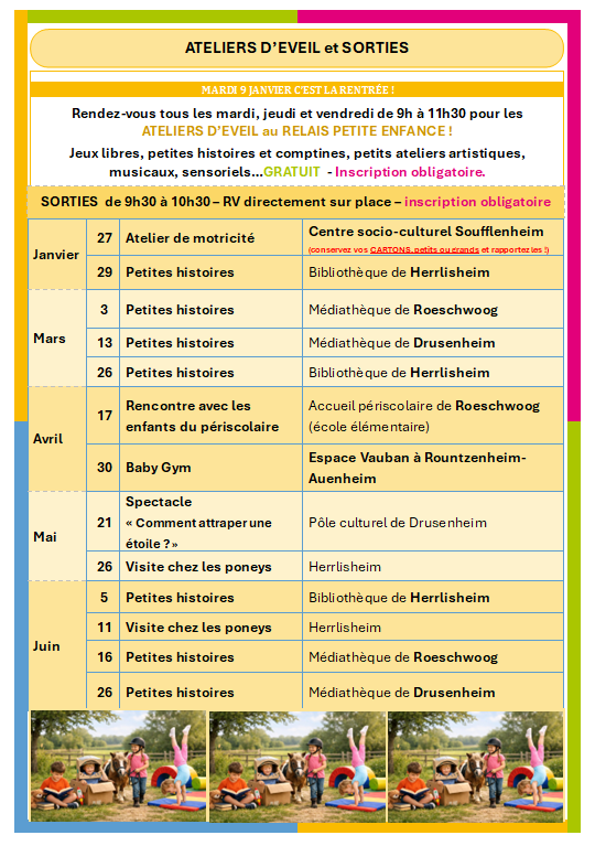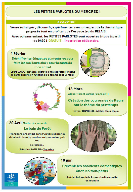 Le Relais petite enfance vous invite également à participer à ses différents temps d’animations : ateliers d’éveil, petites parlotes du mercredi et soirées-rencontres.